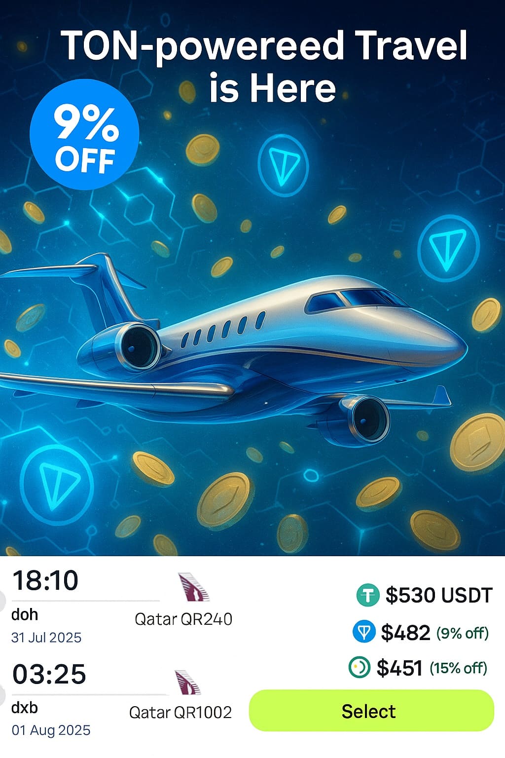 Get 9% OFF on all International Flights Pay with TON 💎 ✈️First TON-powered Flights is Here Cashback. Deals. Crypto-first. Pay with $TON & get 9% OFF on all flights ✈️ Book now: 👉 https://app.peravel.com/flights Complex process? More »